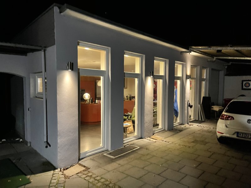 Das Loft liegt im EG eines Mehrfamilienhauses mit eigenem Eingang und Grundstück. Es gibt 3 Stellplätze und ein großes elektrisches Tor um auf das Grundstück zu kommen. Die Außenfläche ist komplett als Terrasse zu nutzen, ein Teil ist überdacht.