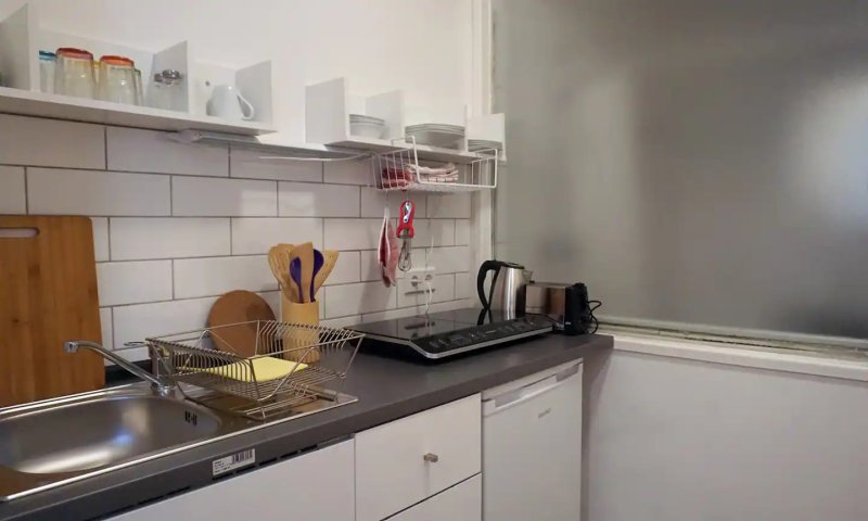 Die Wohnung hat ein Schlafzimmer, das zur Straße hin liegt. Die Fenster sind neu und dicht. Es gibt eine geschlossene Dusche. Es gibt auch eine ausgestattete Küche. Es gibt ein geräumiges Sofa.