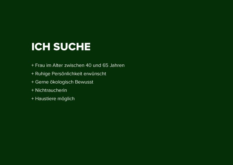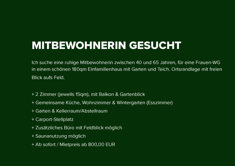 Ich suche eine ruhige Mitbewohnerin zwischen 40 und 65 Jahren, für eine Frauen-WG in einem schönen 180qm Einfamilienhaus mit Garten und Teich. Ortsrandlage mit freien
