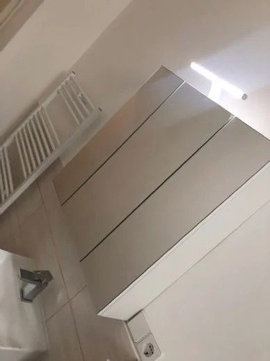 Im Badezimmer gibt es eine ebenerdige Dusche, ein Waschbecken, eine Hängetoilette, einen Schrank mit Beleuchtung und einen Handtuchheizkörper