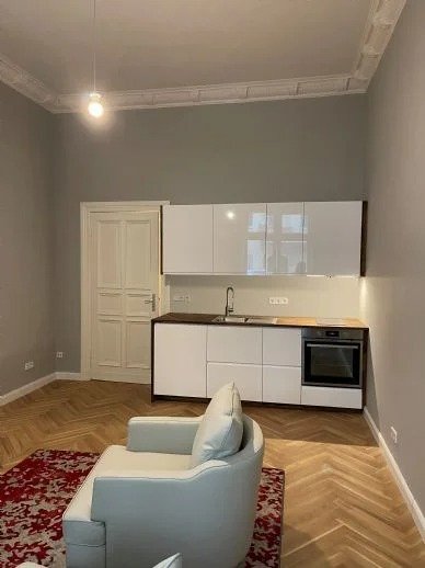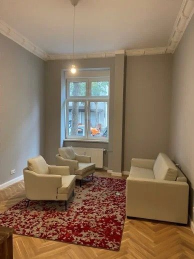 Diese möblierte Wohnung befindet sich in Moabit im Erdgeschoss eines Mehrfamilienhauses aus dem Jahr 1902. Hohe Decken mit Sprossen verleihen der Wohnung ein charmantes Flair.