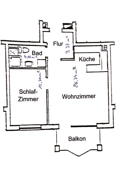 Der Grundriss der gemütlichen Wohnung ist praktisch durchdacht. Das Wohnzimmer mit offener Küche ist ca. 27 qm groß, das Duschbad wurde neutral mit weißen Sanitärobjekten und Fliesen ausgestattet und im Flur gibt es einen sehr geräumigen Einbauschrank für diverse Dinge.