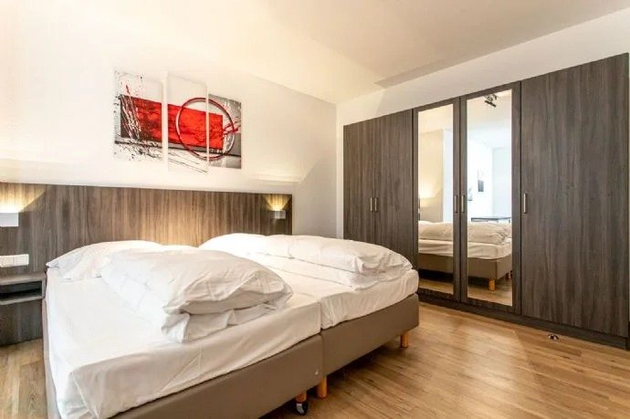 The apartment is elegantly furnished and has a comfortable seating and dining area, a fitted kitchen, a large bed, a spacious wardrobe, a flat screen TV, a desk with chair and other accessories.