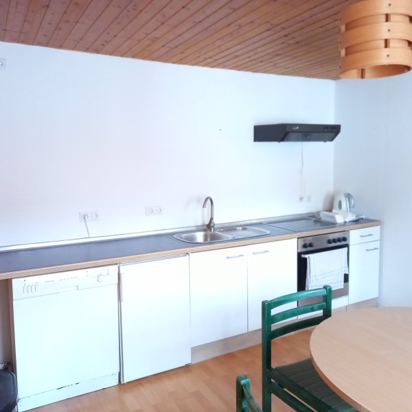 Küchenzeile mit neuwertigen Elt-Geräten, inkl. Geschirrspüler, und gemütlicher Essecke