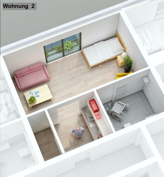 Direkt im Erdgeschoss befindet sich eine Tagespflege, die optional zu Ihrem Wohnalltag in Anspruch genommen werden kann. Alle Wohnungen sind mit einem integriertem Notruf-System ausgestattet und bieten Ihnen rund um die Uhr Sicherheit.
