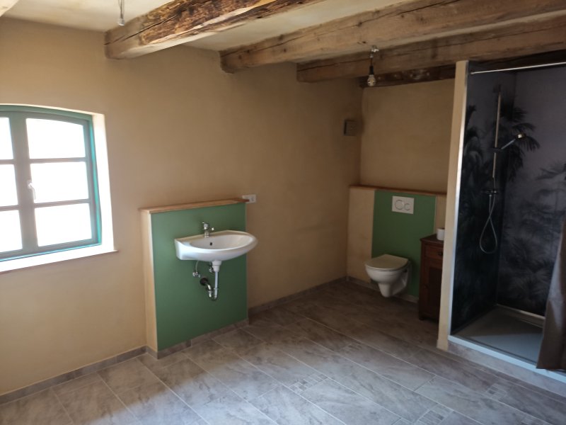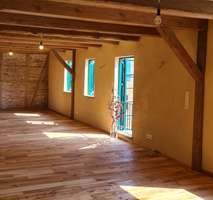 In der gesamten Wohnung ist eine Balkendecke mit einer energieeffizienten Deckenheizung. Neue Fenster und Türen und eine ausgezeichnete Wärmedämmung in Kombination mit ökologischen Lehm-Baustoffen sorgen für ein gesundes Raumklima. Im Badezimmer sind Fliesen, die restliche Wohnung hat Vollholzdielen (Esche).