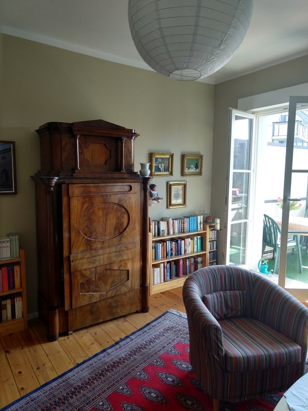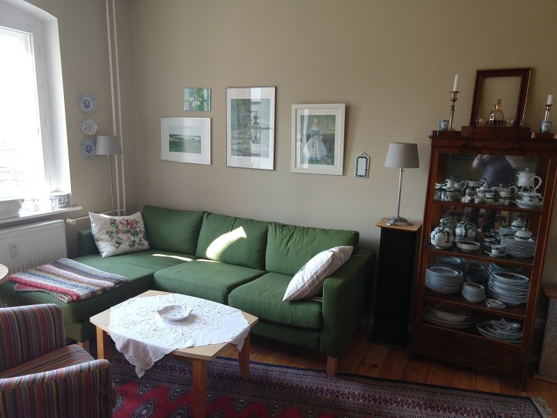 Gehobene Komplettausstattung: großer Sonnen-Balkon, schöne abgezogene Dielen, toller Kaminofen im Wohnzimmer, Internet, W-Lan, TV mit Soundbar incl.,