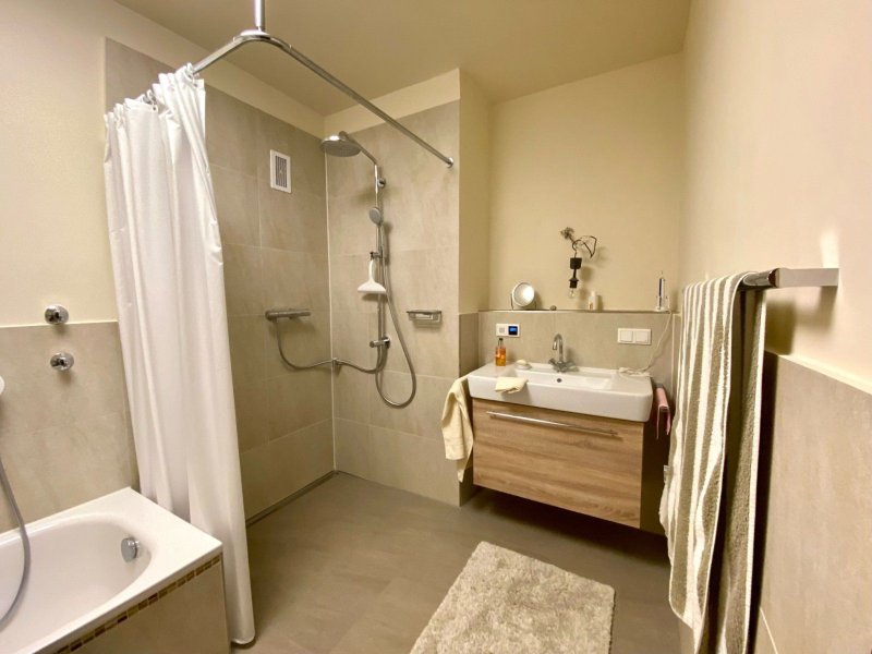 Mit Küche, Bett, Balkon, Abstellraum, Kellerraum, KFZ-Stellplatz, Waschmaschine, Badewanne und Dusche.