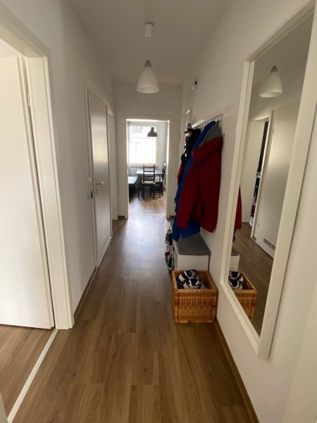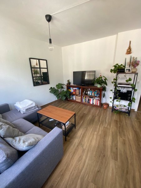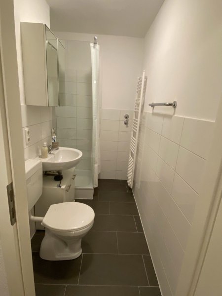 Die Wohnung besteht aus Wohn-und Esszimmer, Schlafzimmer, Küche und Bad und hat 55 Quadratmeter. Von der Diele aus sind alle Zimmer erreichbar. Das Schlafzimmer ist durch die Ausrichtung ins Grüne sehr ruhig. Die Wohnung verfügt über ein Bad mit einer Dusche.