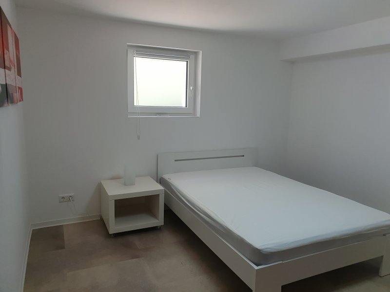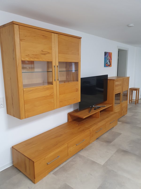 Im Wohn-/Schlafbereich befindet sich ein Bett (neu, inkl. neuer Matratze), ein Kleiderschrank (neu), eine Wohnzimmerschrankwand mit Fernseher.
