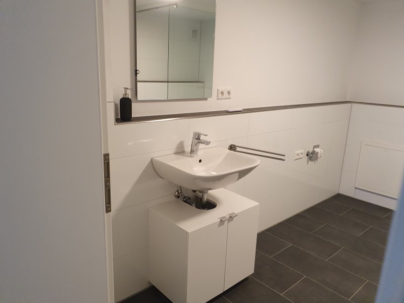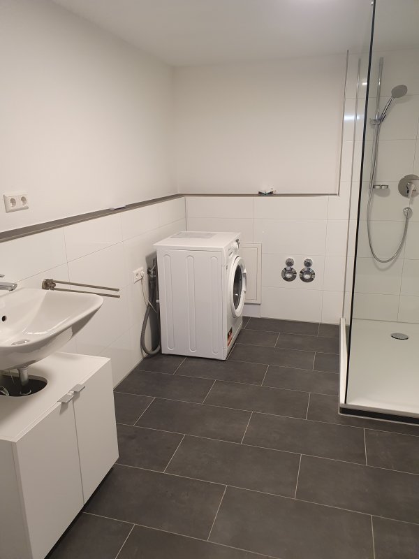 Waschmaschine steht im Bad und Trockneranschluss vorhanden.