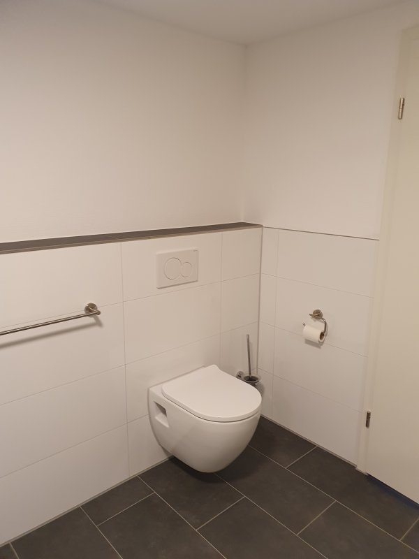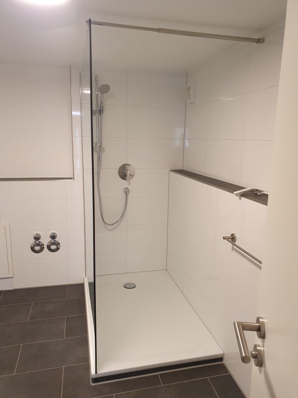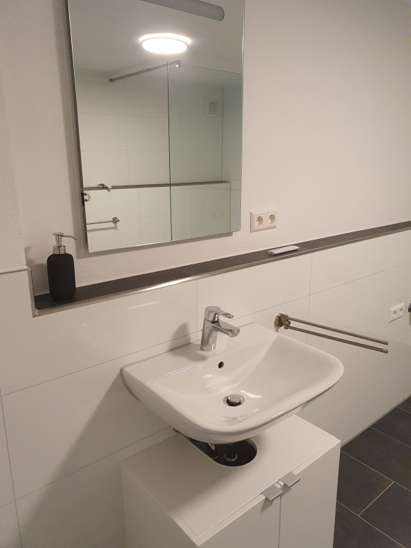 Das innenliegende Bad ist ebenfalls saniert, halbhoch gefliest und mit einer bodengleichen Dusche ausgestattet.