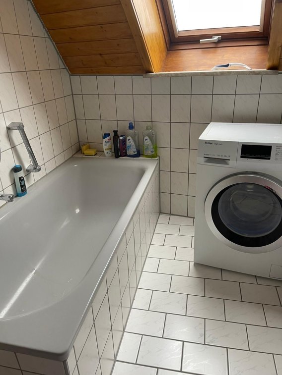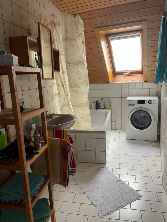 Das Tageslichtbad verfügt über ein Dachfenster, eine Badewanne, sowie einen Waschmaschinenanschluss.