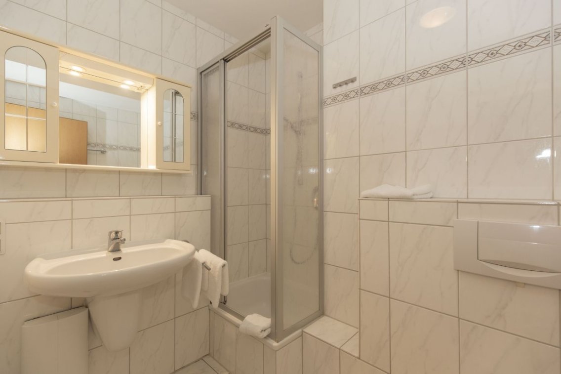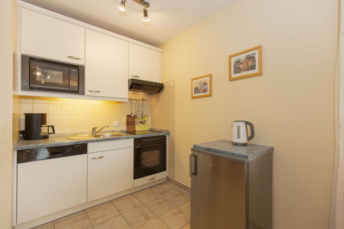 Die Küchenzeile ist komplett ausgestattet mit Geschirrspüler, Backofen, Mikrowelle, Ceranfeld, Kühlschrank sowie allen erforderlichen Utensilien und Geräten von der Kaffeemaschine bis zum Mixer. Durch den Flur mit Garderobe gelangen Sie zum Duschbad mit Föhn.