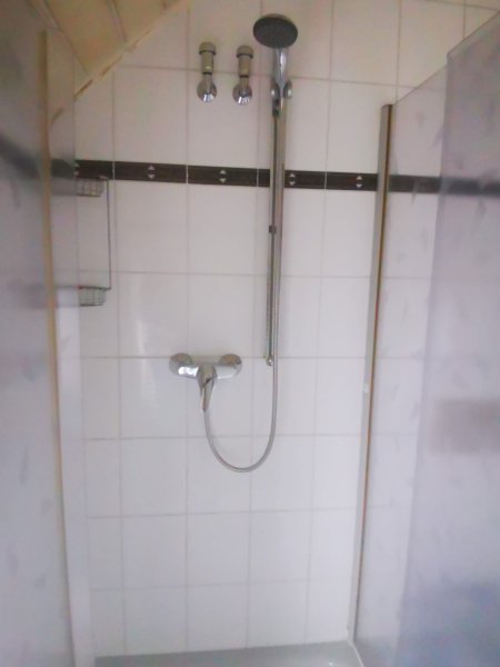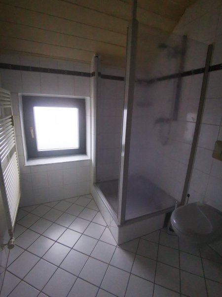 Das helle Tageslichtbad verfügt über eine Dusche sowie über einen Spiegelschrank.