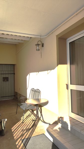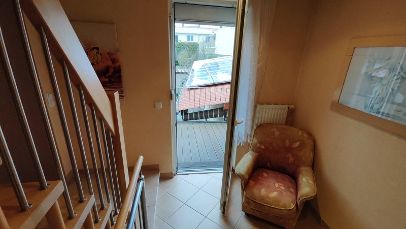 Der überdachte Eingangsbereich bietet zusätzlich zum Balkon ein ein Plätzchen für Tisch und Stuhl an der frischen Luft.