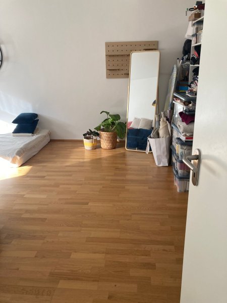 Das ZIMMER ist 25m2 groß, liegt mit Blick auf den Garten. Es ist mit Sofa, Stehlampe, Bücherregalen, einem kleinen Schrank, zwei Hängeregalen, einem Wollteppich und einem Standspiegel ausgestattet. Bett/Matratze müsste mitgebracht werden.