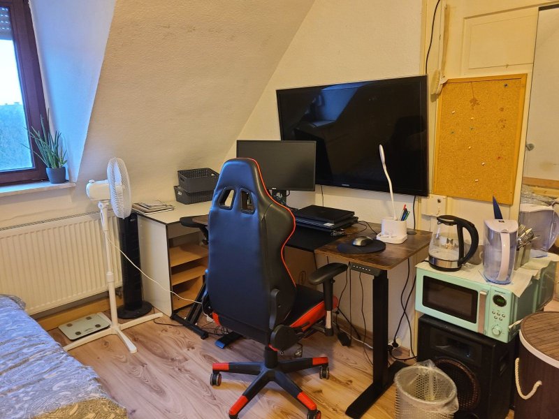 Das Zimmer verfügt über einen Kleiderschrank, einen elektrischen Stehschreibtisch, einen Fernseher, eine Mikrowelle, ein Bett, ein Sofa, einen Spielesessel und vieles mehr.