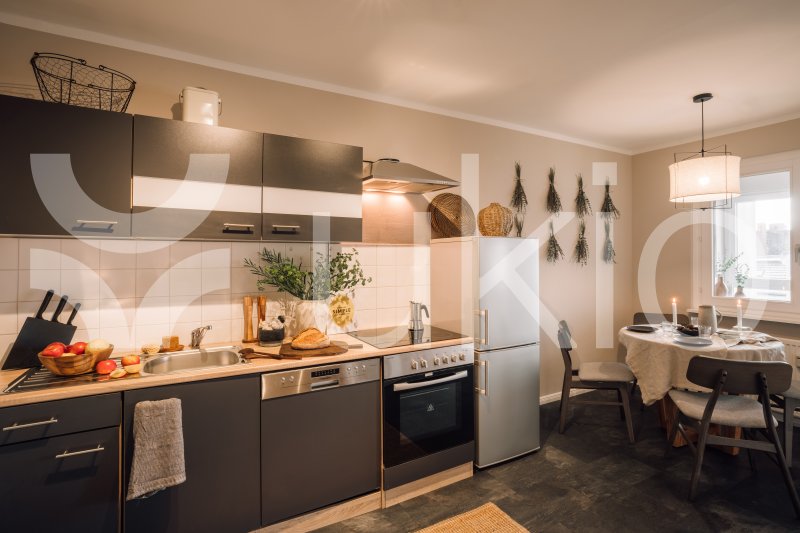 The living room has a full entertainment system and many wooden and green touches to uphold the grassland theme. The separate sunroom office space sits behind the living room and ensures that you won’t miss a beat while living in Berlin. The dining room table sits in a room adjacent to the office and leads to the modern and fully equipped kitchen. Fully furnished, this home comes with everything you need, including bedding and linens.