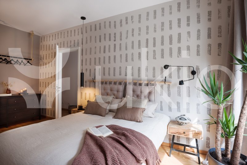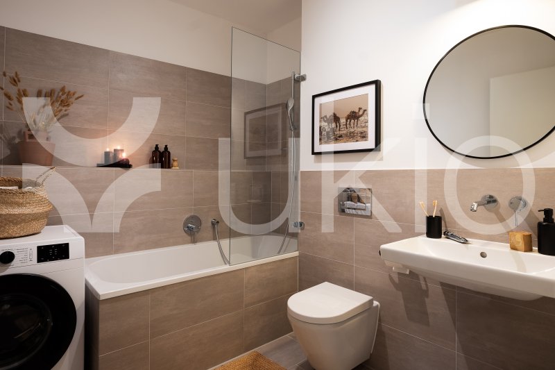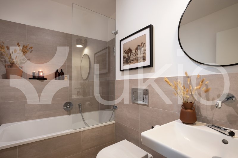 Dankil’s entrance is bright and contemporary. Straight on, guests will find the home’s storage room. Down the hallway, the first door leads to the bathroom. The bathroom continues with the theme of contemporary as a cool gray-blue tiling runs through the space. The bathroom is completed with a shower-tub combination.