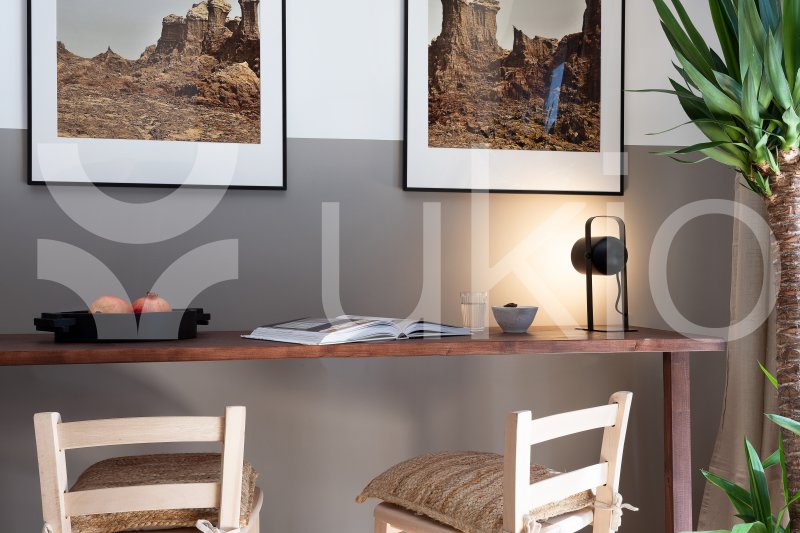 The next door on the right leads to Danakil’s bedroom. Organic stamp prints cover the accent wall behind the queen-sized bed. Nearest to the bedroom’s entrance is a luminous, dedicated workstation.