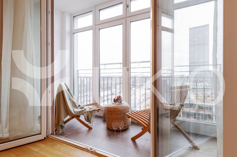 The living room benefits from light flooding in from the balcony. The balcony sitting area has double doors, so guests can enjoy the space in both the summer and winter. Espera also showcases a rustic wooden table, a full entertainment system, and a dedicated workstation in the living room.