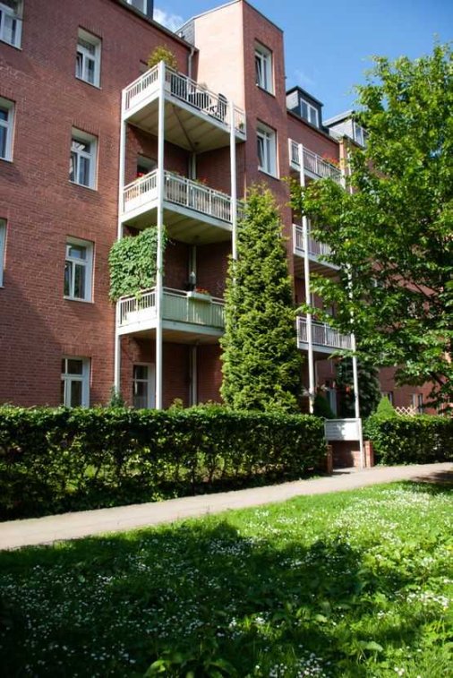 Kernsaniertes Gründerzeithaus mit wunderschöner Klinkerfassade in geschlossener Karreebebauung. Idyllischer grüner Innenhof mit Bachlauf und Teich. Nur wenige Schritte entfernt liegen der Zugang zur Tiefgarage und ein schöner Kinderspielplatz mit Spielburg, Sandfläche und Wipptieren.