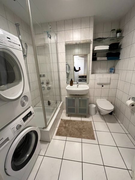 Badezimmer: Duschkabine und WC. Waschmaschine und Trockner von Siemens.