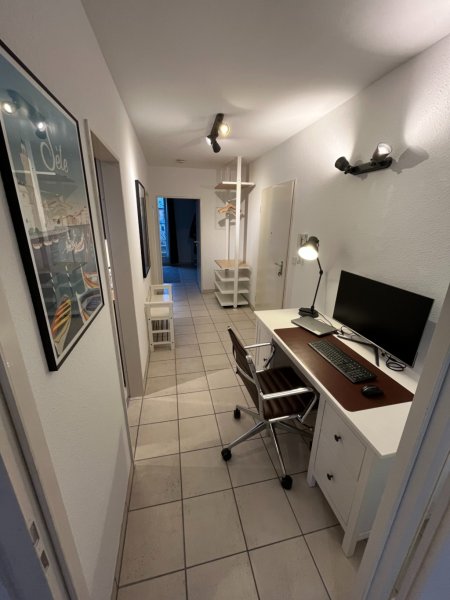 Flur: Garderobe und Schuhregal. Arbeitsecke mit Schreibtisch und High-End Computermonitor.