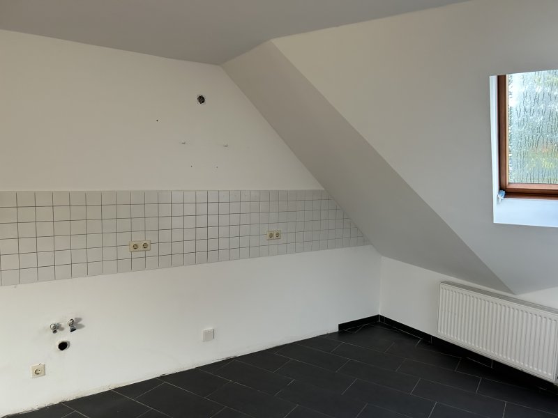 Dachgeschosswohnung in Wilhelmshaven Maadebogen in einem 4-Familienhaus mit zwei Eingängen. In der Wohnung existiert ein großer Wohnraum mit angrenzendem Küchenbereich. Des Weiteren sind zwei Zimmer und ein Bad vorhanden. Im Bad mit Fenster sind eine Dusche, eine Wanne, ein Waschbecken und eine Toilette installiert. Ein Platz für eine Waschmaschine und einen Trockner sind vorhanden. Die Zimmer sind mit Fliesen bzw. Laminat ausgelegt. Die Wände und Decken sind weiß gestrichen. Eine Etage höher ist der Dachboden zu einem Zimmer ausgebaut.