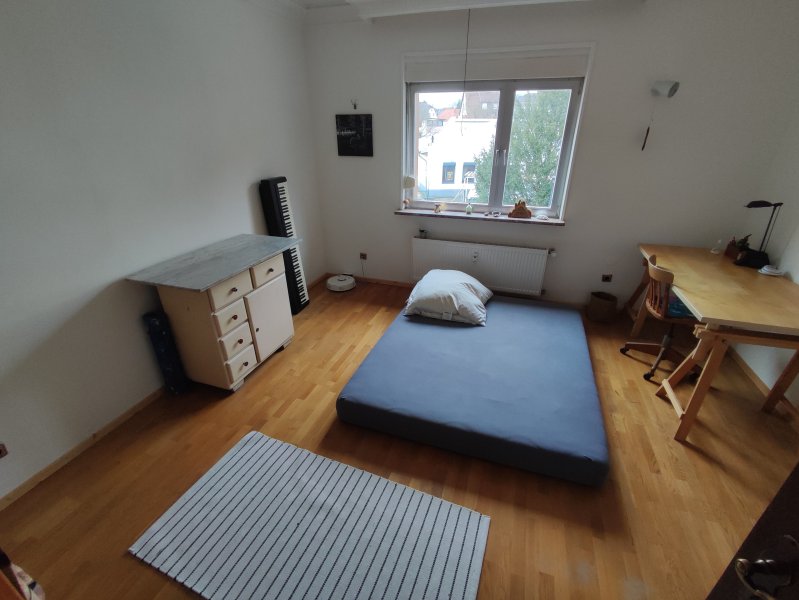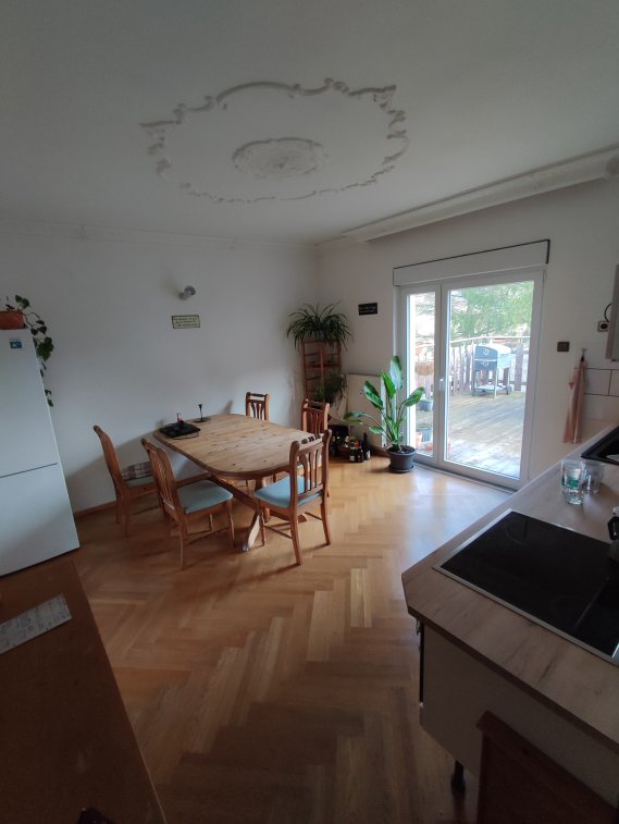 Die Wohnung ist komplett möbliert. Sie befindet sich im 1. Stock. Vermietet werden Schlafzimmer/Büro, Wohnzimmer, Bad und Küche/Esszimmer. Von der Küche kommt man auf einen 20m² großen Balkon mit Grill und Paletten Couch. Es gibt auch einen kleinen Garten. Waschmaschine im Keller. (Das Dachgeschoss gehört auch zur Wohnung, wird aber nicht mit vermietet)
