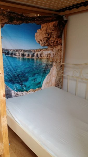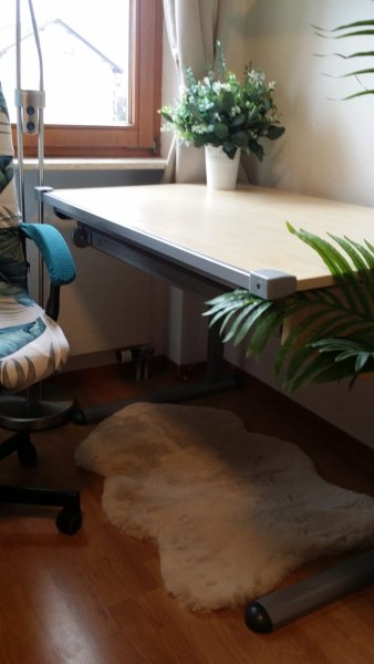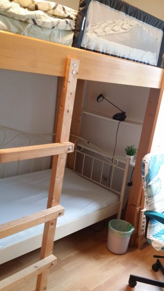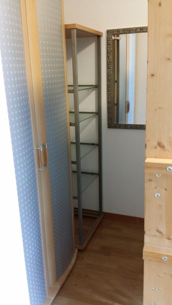 Es ist mit einem Holzhochbett (1,20 x 2,00 m), einem Kleiderschrank, 2 gr. Glas/Holzregalen, sowie 1 Chefsessel und Schreibtisch ausgestattet. Unter dem Hochbett befindet sich ein Tagesbett.