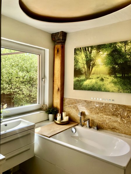 Im Erdgeschoß befindet sich das einzige Bad mit Fußbodenheizung, Badewanne und separater Dusche.