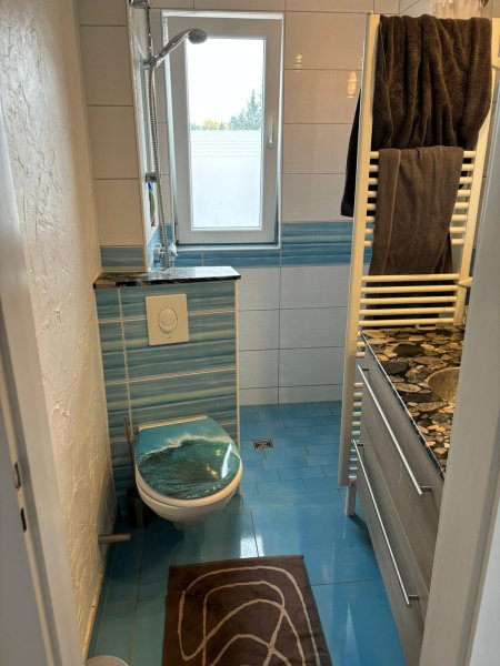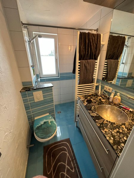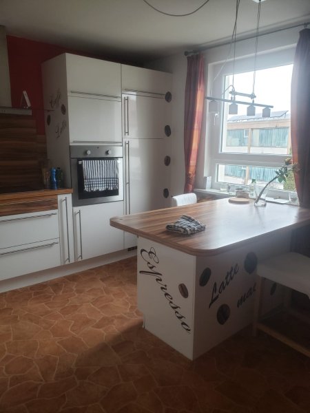 Normal ausgestattetes Zimmer. Ein großes Badezimmer mit Badewanne, ein weiteres separates WC, große Küche m. Essplatz, sehr großes Wohnzimmer mit großem Sofa und großem Esstisch.