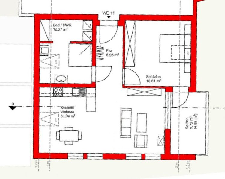 2-Zimmer-Wohnung, EB-Küche, Bad mit Abstellraum, großer Balkon, Pkw-Stellplatz
