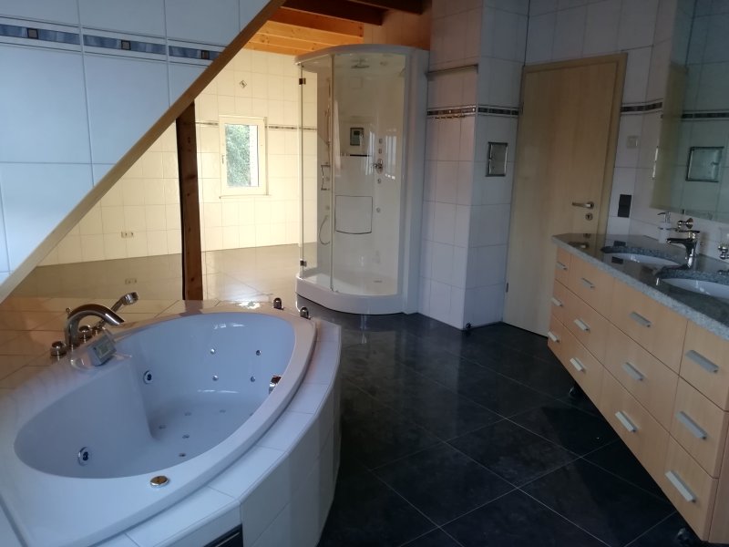 Die Wohnung ist ausgestattet mit einem großzügigen Badezimmer mit Toilette, Urinal, Bidet, 2 Waschtische mit Unterschrank, Schubladen und Granitplatte. Darüber befindet sich ein extra großer Spiegel. Zwei außergewöhnlich große Schubladen sind in der Wand. Eine große Badewanne und eine Luxus Dampf-Aroma- Dusche inklusive zwei Sitzen, LED-Licht und Radio inkl. Im hinteren Bereich gibt es Anschlussmöglichkeiten für Waschmaschine und Trockner.