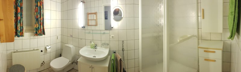 - im Bad sind Toilette, Waschbecken und Duschkabine.