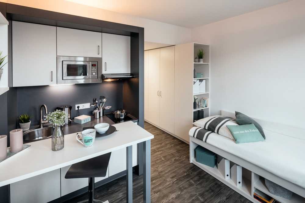 Im Leonis, unserem Studentenwohnheim in Münster, wohnen Sie in perfekter Lage: nur wenige Minuten von der Innenstadt und der Universität entfernt. Sie sind in einem von 182 modern ausgestatteten Studentenapartments in einem charmanten Gebäude untergebracht. Sie können zwischen einem Studio oder einer WG für zwei Personen wählen. Wenn Sie auf der Suche nach etwas Besonderem mit Aussicht sind, mieten Sie eine unserer Dachgeschosswohnungen. Dachschrägen und große Oberlichter sorgen für eine besonders gemütliche Atmosphäre.