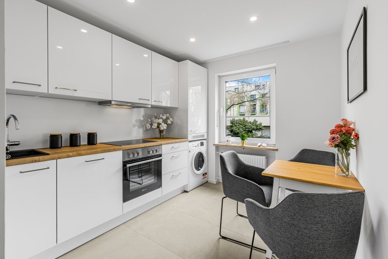 Eine Einbauküche ist Bestandteil der Wohnung und besitzt eine Wasch- und Spülmaschine. Die Zimmer sind mit einem Bett, Kleiderschrank, Schreibtisch und Stühlen möbliert. Ein kleiner Essbereich ist ebenfalls vorhanden.