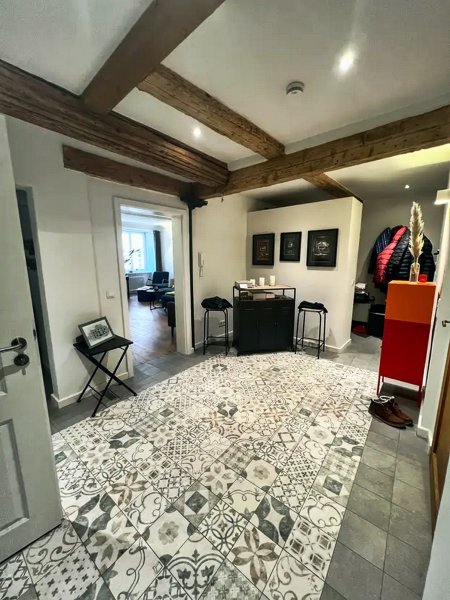 Treten Sie ein in eine besondere Wohnung in Passau, wo historische Balken eine charmante Geschichte erzählen und moderner Komfort Sie erwartet. Die Lobby empfängt Sie mit eleganten Fliesen und führt Sie in eine Welt, die das Alte ehrt und das Neue willkommen heißt.