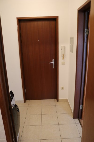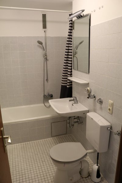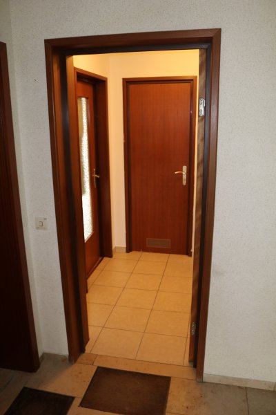 Im Flur, Bad und Küche sind Fliesen verlegt, im Wohnraum Laminat.