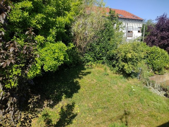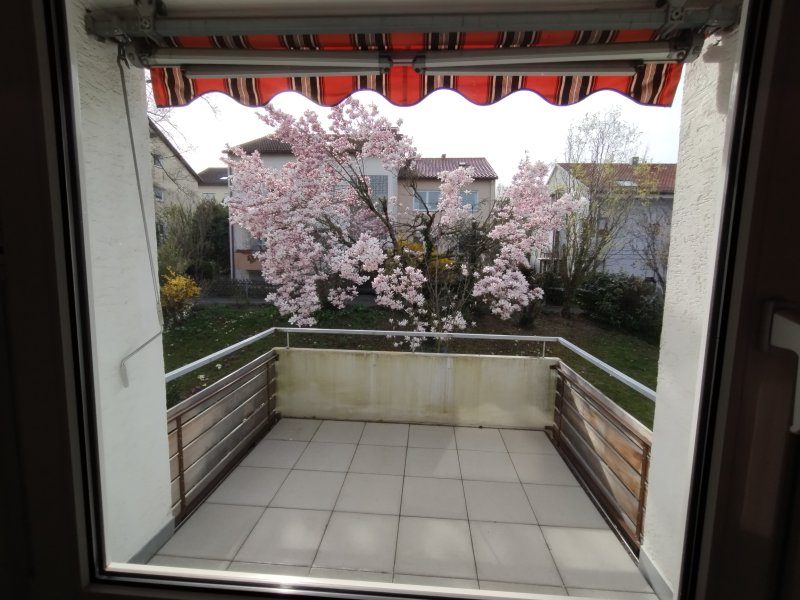 Wohn- Esszimmer, Schlafzimmer, Einbauküche, Diele, Bad (Tageslicht) mit Dusche und Wanne, sep. WC mit Waschbecken, Gartenanteil. Die Wand zwischen Wohn- und Esszimmer ist großflächig geöffnet. Ein Balkon mit Markise und eine breite Fensterfront geben den Blick auf den Magnolienbaum im Garten frei.