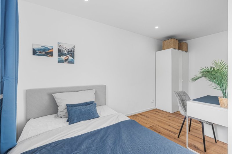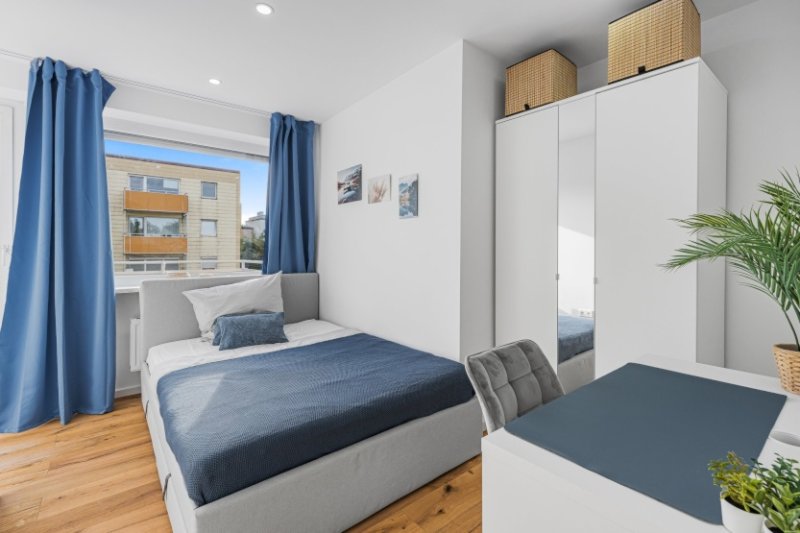 Eine Einbauküche ist Bestandteil der Wohnung und enthält eine Spülmaschine. Die Zimmer sind mit einem Bett, Kleiderschrank, Schreibtisch und Stühlen möbliert. Eine Waschmaschine ist im Bad verbaut.