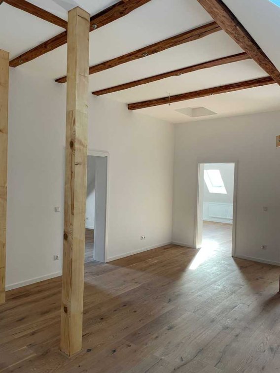 Die Wohnung verfügt über ein geräumiges Wohnzimmer mit offener Wohnküche und über drei Schlafzimmer. und ein großes Atrium Das Badezimmer hat eine Badewanne. Die Einbaukücke ist komplett ausgestattet. Besonderen Charakter verleihen der Wohnung ihre hohen Decken und großzügigen Fenster sowie der in die Architektur eingebundene historische Dachstuhl, der mit dem Echtholzboden korrespondiert.