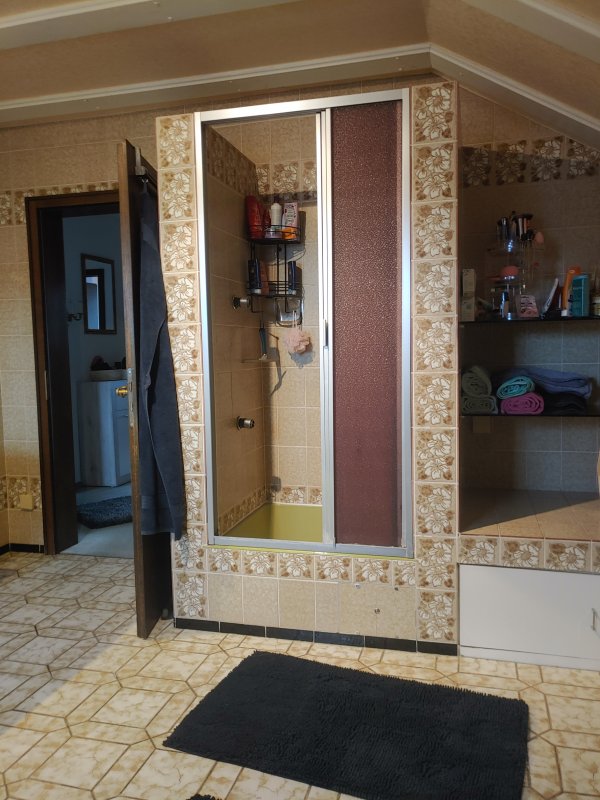 Badezimmer mit Dusche, WC, Spiegelschrank und Fenster