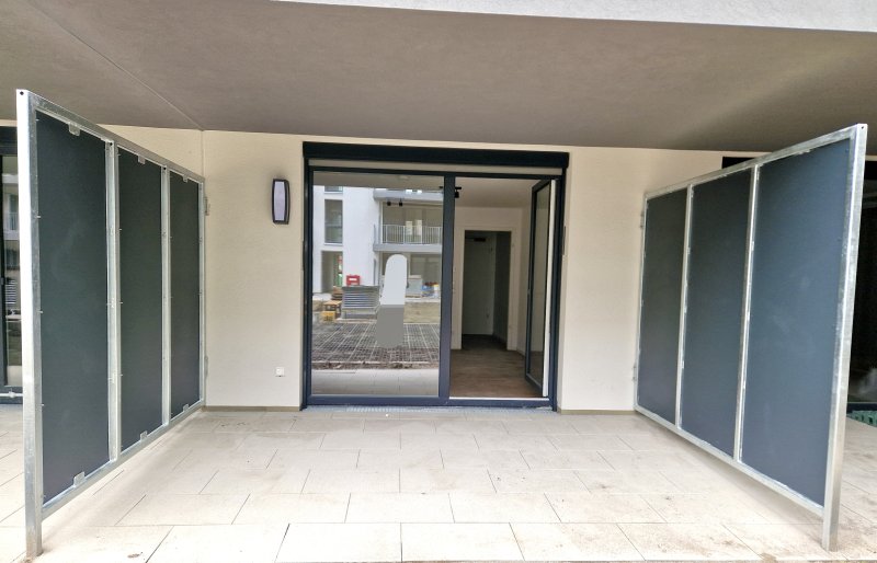 Die Terrasse der Wohnung richtet sich in einen ruhigen und begrünten Innenhof und wird durch eine Hecke sichtgeschützt abgegrenzt.