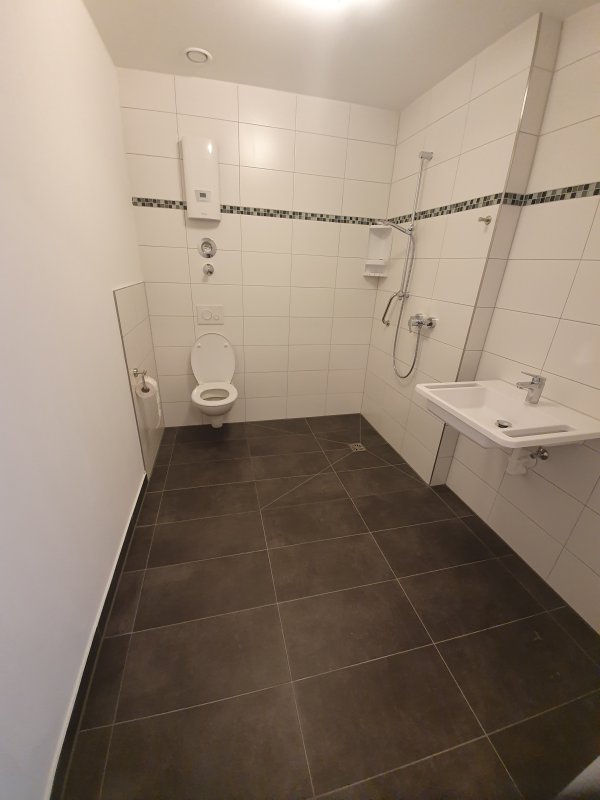 -Bad mit bodengleicher Dusche und barrierefreier Waschtisch mit integrierter Aufstehhilfe
