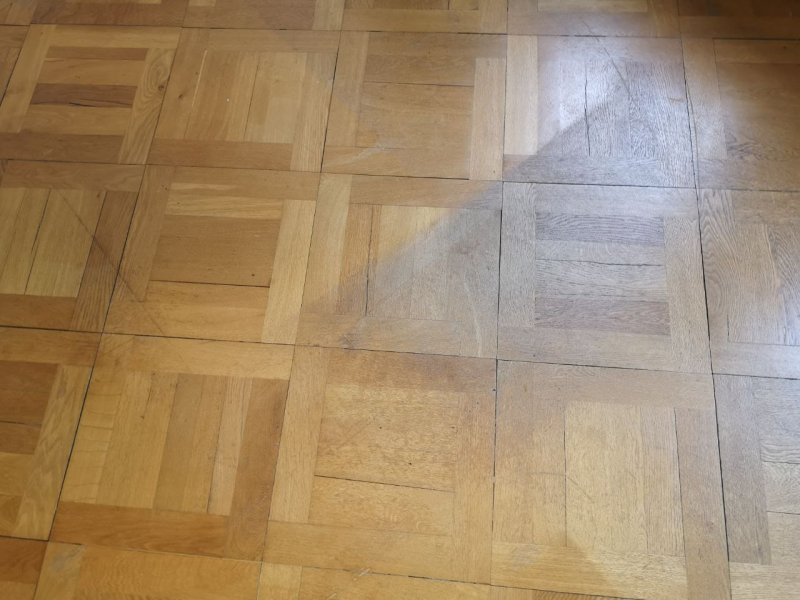 Küche und Bad sind etwas in die Jahre gekommen, jedoch noch funktional. Parkettböden durchgängig in den vier Zimmern, teils mit Abnutzungsschäden.