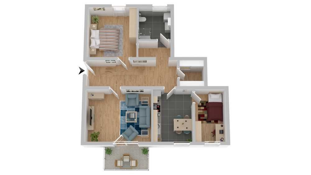 Man betritt die Wohnung über einen großzügigen Flur, der reichlich Stellfläche für Bücherregale oder Kommoden bietet. Vom Flur aus hat man Zugang zu Wohnzimmer mit Balkon, Schlafzimmer, Küche, Abstellraum und Badezimmer. Durch die Küche erreicht man ein kleines Gästezimmer / Büro.
