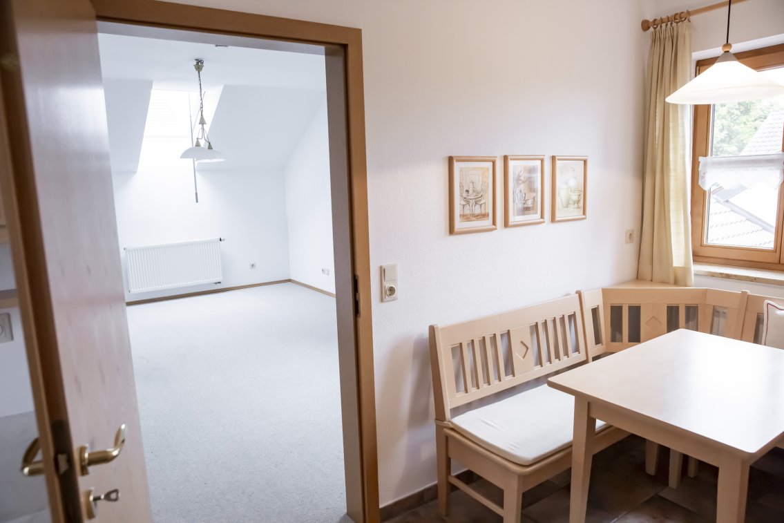 Ein lichtdurchflutetes Treppenhaus mit Zugang zu einem Balkon und möglichen Nutzung als Garderobe führt zur ideal aufgeteilten Wohnung. Alle Dachschrägen beginnen auf einer angenehmen Höhe von 168 cm. Ein abgeschlossener Flur führt zu den großzügigen Räumen. Das Schlafzimmer ist mit Massivholzmöbeln und Einbauschrank ausgestattet, die bei Bedarf übernommen werden können und verfügt über ein bodentiefes Fenster. Das Gäste-/Kinderzimmer verfügt ebenfalls über ein bodentiefes Fenster und bietet ausreichend Platz und Stellfläche. Das lichtdurchflutete Badezimmer ist ausgestattet mit Badewanne und Dusche und hat außerdem einen Anschluss für eine Waschmaschine. Ein großzügiger, heller Wohnbereich bietet viel Freiraum und Stellmöglichkeit. Die angrenzende Küche ist voll ausgestattet und verfügt über eine gemütliche Essecke sowie einer abgetrennten Speisekammer mit integriertem Regal und Fenster.